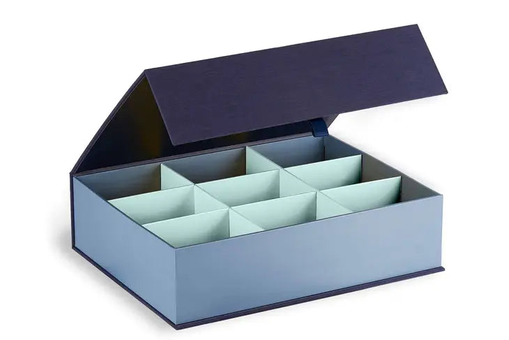 Use the adjustable dividers to customize the box with up to 9 compartments or simply remove them altogether. Hand-illustrated labels guide you in what to save and where to find it.