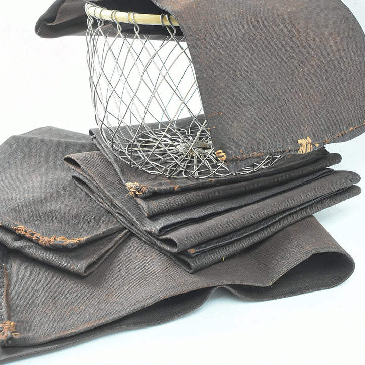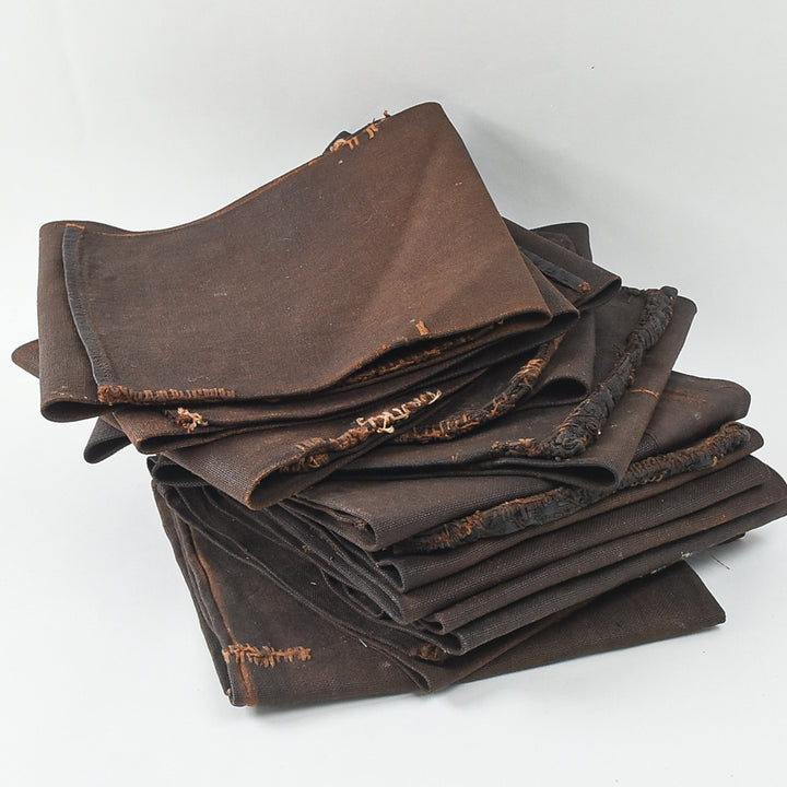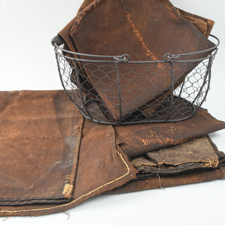 These vintage sakabukuro (酒袋), or sake-straining bags, come from breweries in Japan where they spent decades in service filtering fermented rice mash during sake production. Each bag was dipped in kakishibu—a natural, fermented persimmon tannin dye prized for its durability, water-resistance, and deep earthy color.